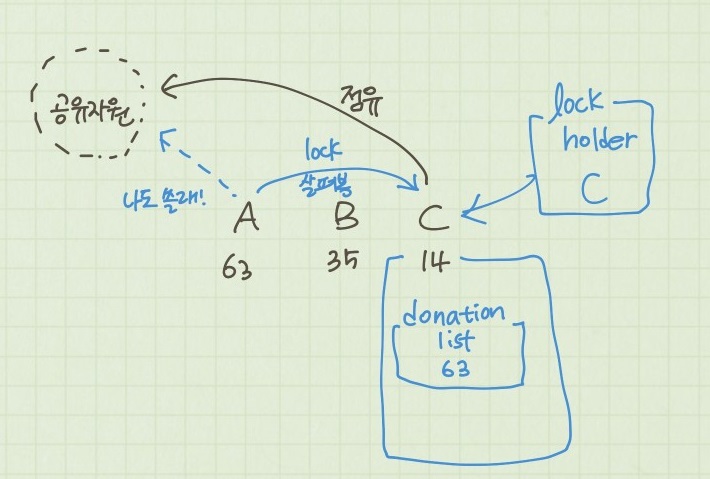 그렇기 때문에 현재 공유자원을 점유하고 있는 thread(c,14) 내부에 donation list에 네(C,14)가 공유자원을 다 쓰면 내(A, 63)가 쓰겠다고 우선순위를 기부하는 것이다. 수시로 lock(현재 공유자원을 쓸 수 있는지)을 살펴보면서 busy waiting하는 것이다.