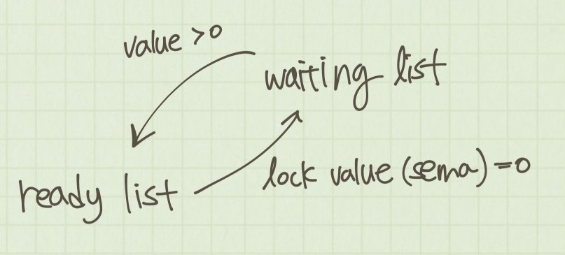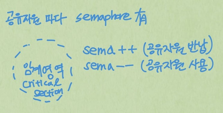 공유자원을 대기하고싶은 thread는 이 sema값을 살펴보면서 대기하고 있다가 접근할 수 있으면, 공유자원을 점유해 사용할 수 있는 것이다. sema값이 0이면 임계영역 내 모든 공유자원이 사용중이라는 의미이다.