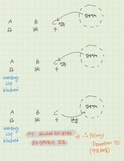 blocked 처리해 대기 리스트에 있으면 현재 공유자원을 점유하고 있는 thread(C, 4)의 우선순위가 대기하고 있는 thread의 우선순위(A, 63)보다 낮을 때 발생한다. 이럴 경우, C가 공유자원을 다 쓰고 lock을 해제할때 우선순위기가 A보다 낮은 B가 공유자원을 점유할 수 있어 우선순위가 역전된다. 이를 방지하기 위해 priority donation 개념이 생겼다.